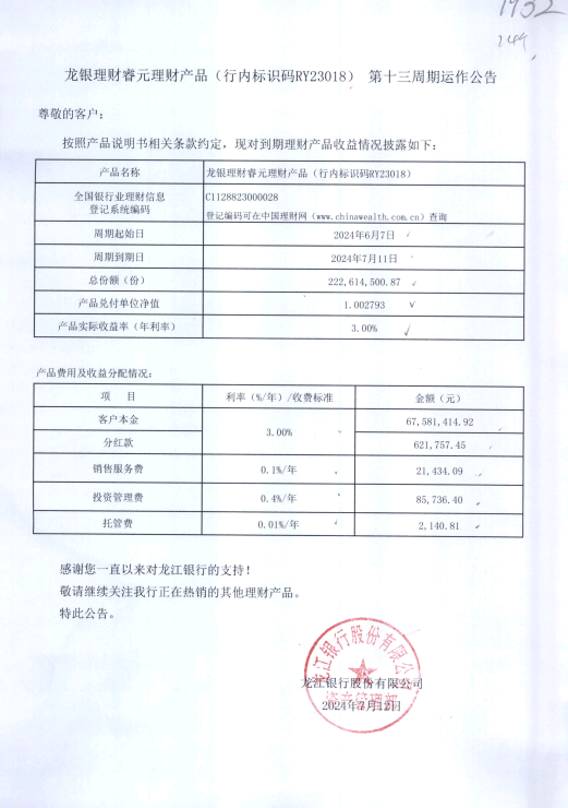 龙银理财睿元理财产品(行内标识码RY23018)第十三周期运作公告