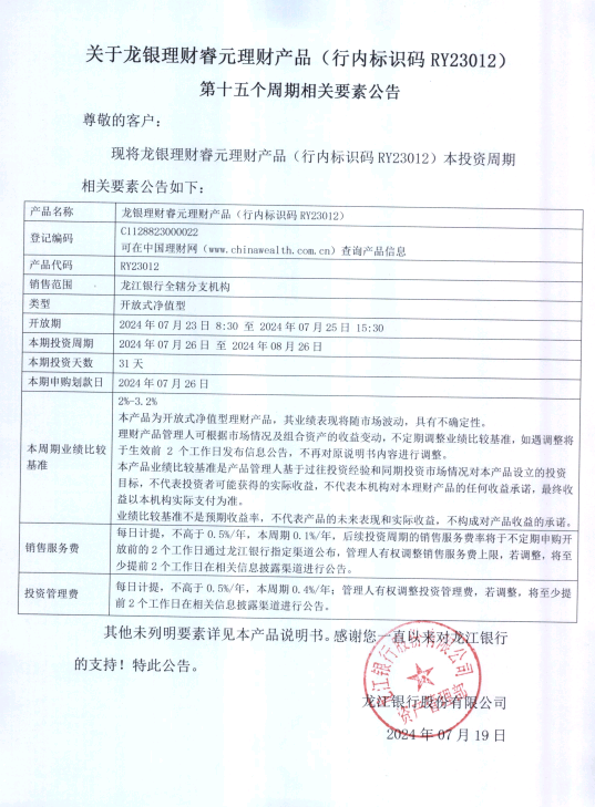 关于龙银理财睿元理财产品(行内标识码RY23012)第十五个周期相关要素公告