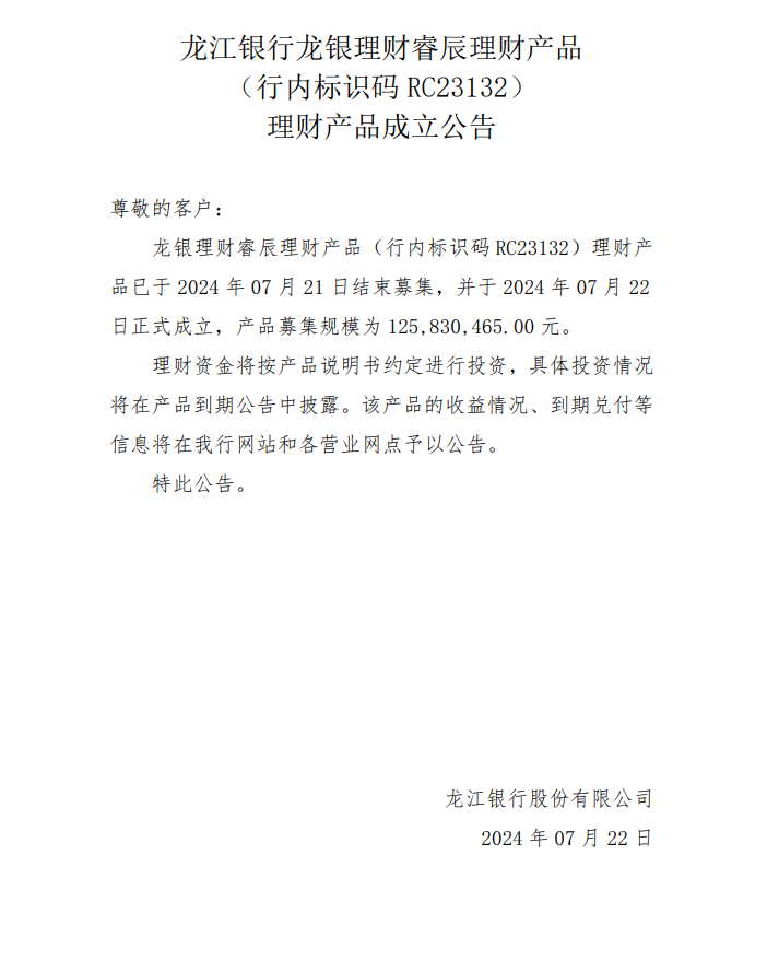 龙江银行(RC23132)2024年07月22日理财产品成立公告