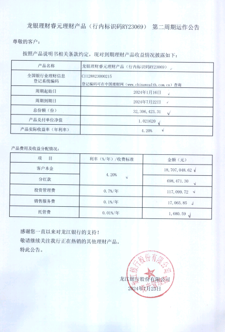 龙银理财睿元理财产品(行内标识码RY23069)第二周期运作公告