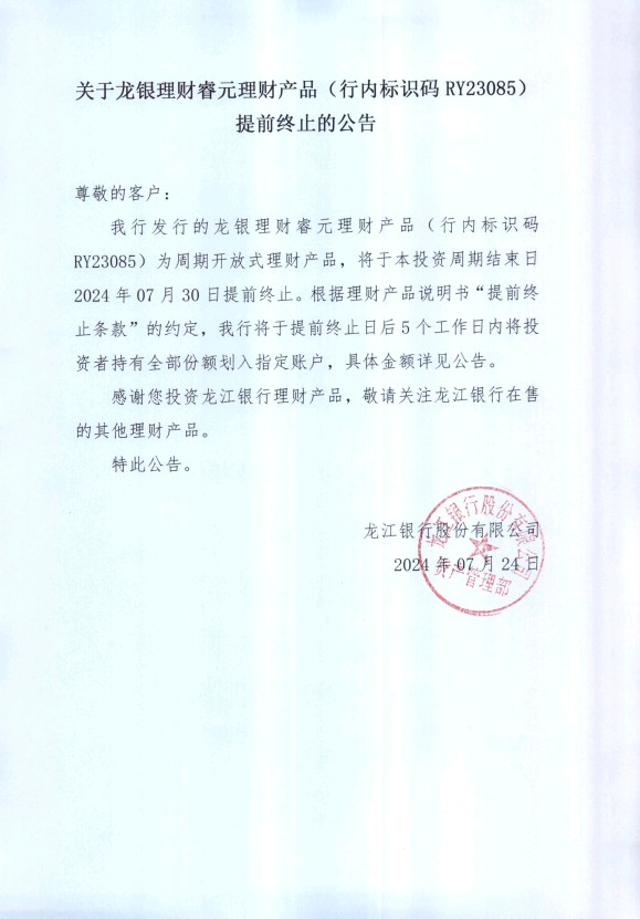 关于龙银理财睿元理财产品(行内标识码RY23085)提前终止的公告