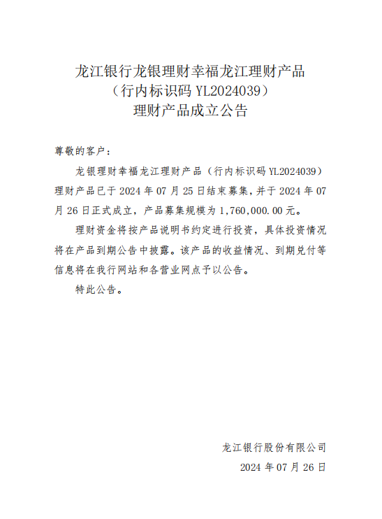 龙江银行(YL2024039)2024年07月26日理财产品成立公告
