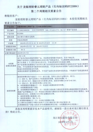 龙银理财睿元理财产品(行内标识码RY23084)第二个周期相关要素公告