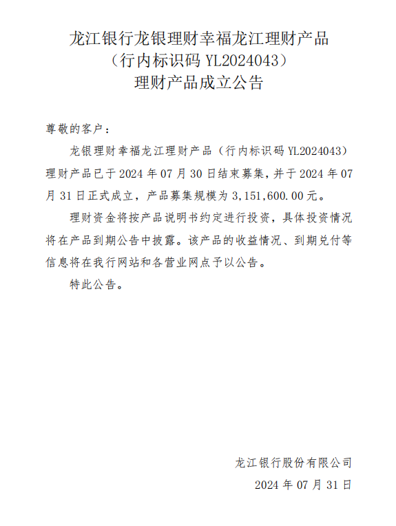 龙江银行(YL2024043)2024年07月31日理财产品成立公告