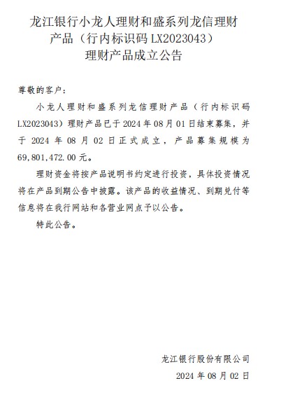 龙江银行(LX2023043)2024年08月02日理财产品成立公告