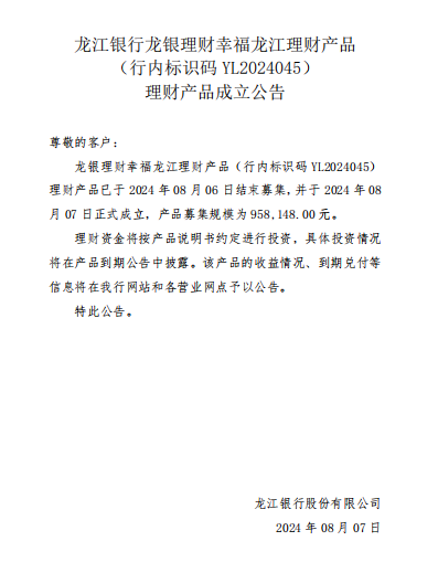 龙江银行2024年08月07日理财产品成立公告(YL2024045)