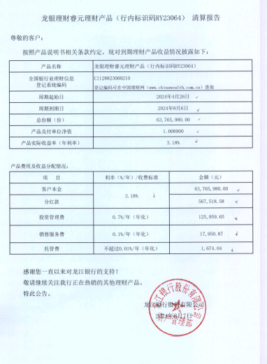 龙银理财睿元理财产品(行内标识码RY23064)清算报告