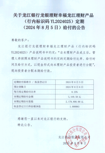 关于龙江银行龙银理财幸福龙江理财产品(行内标识码YL2024025)定期(2024年8月5日)给付公告
