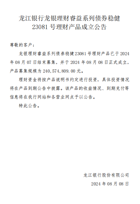 龙江银行2024年08月08日理财产品成立公告(RY-ZQWJ23081)