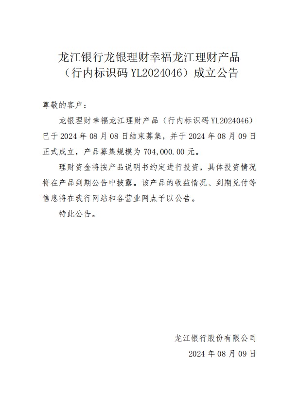 龙江银行2024年08月09日理财产品成立公告(YL2024046)