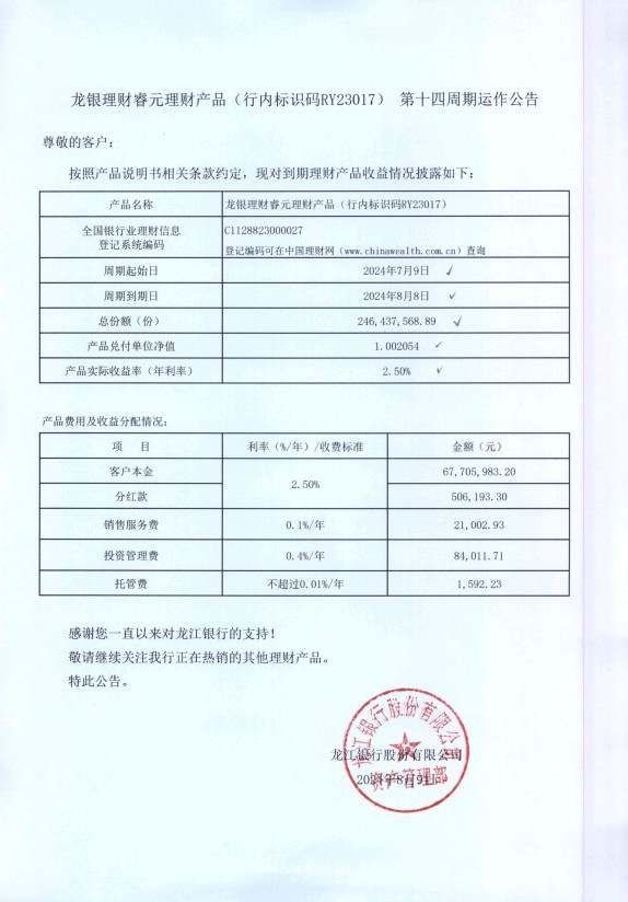 龙银理财睿元理财产品(行内标识码RY23017)第十四周期运作公告